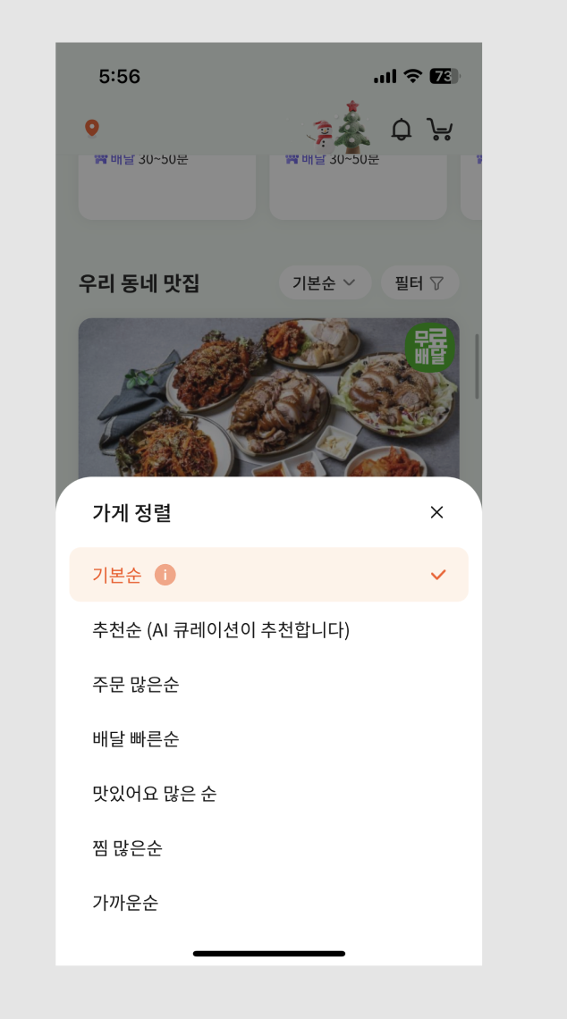 검색바 - 음식 카테고리 - 맛집 카테고리 - 배너 - 할인 이벤트 - 브랜드 (오늘 땡길만한 브랜드) - 무료배달 리스트 (배달비가 부담된다면) - 새로 들어온 맛집 - 우리 동네 맛집 (정렬) 순으로 되어 있었다.