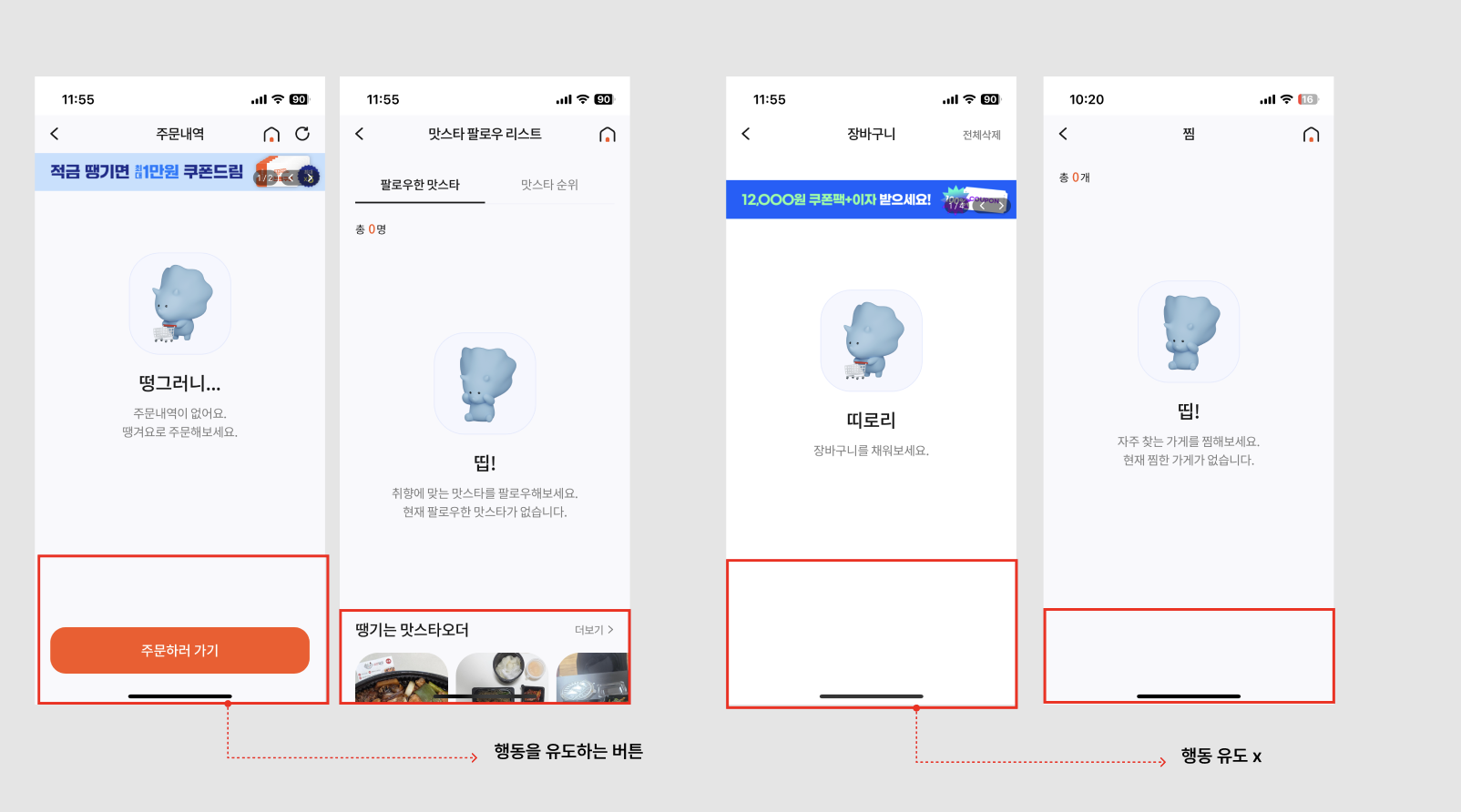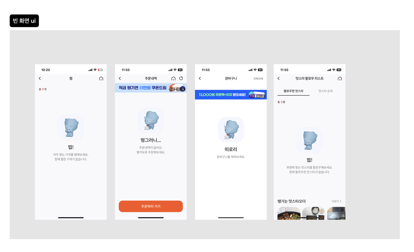 맛스타와, 가게 등의 콘텐츠와 관련된 빈 화면은 캐릭터가 울고 있는 화면으로 보여주어 유저의 행동을 촉진한다.