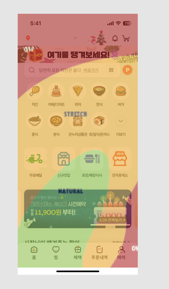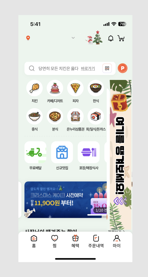 홈 화면을 뜯어보니 여러 배달 어플과 비슷하게 구성되어 있었다.