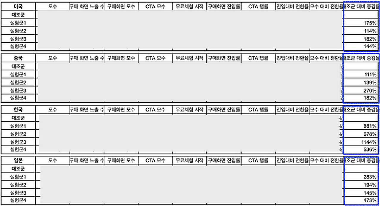 실험 결과 미국에서는 1.6배, 중국에서는 1.5배, 일본에서는 2배 가량의 구독 전환율이 실험군에서 보였고,